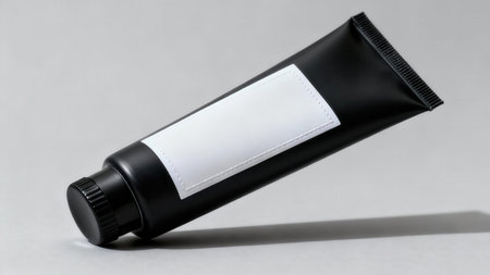 Sleek black squeeze tube mockup featuring a textured white label area and ribbed plastic cap, dramatically lit on a neutral gray surface creating a sharp, dark shadow below the object.