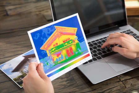 Close-up Of A Person Detecting Heat Loss Of A House Using Laptop On Desk