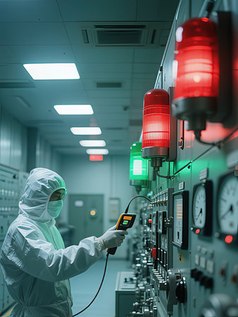 Scientist in hazmat suit using digital thermometer to measure temperature in a laboratory