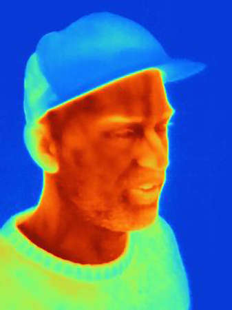 Thermal image of young man wearing face mask and baseball cap