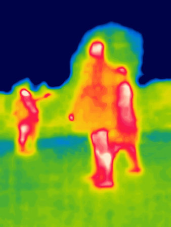 A group of people as a dynamic combination of temperature zones. Image from thermal imager device.