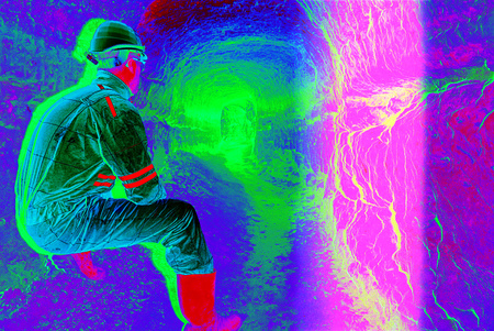 The dead man, specter speaks with gestures. Image from thermal imager device.