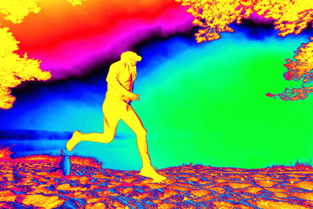 Male runner run hard in white sand of beach during morning exercising. Gamma radiation spectrum in simulator.