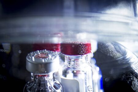Medical vial for injection on blue background, transparent glass bottle, drug medicine vaccine dose. Coronavirus covid-19 flu vaccination concept.