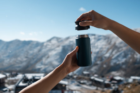 Cozy gloved hand holding stainless steel thermos in snowy weather