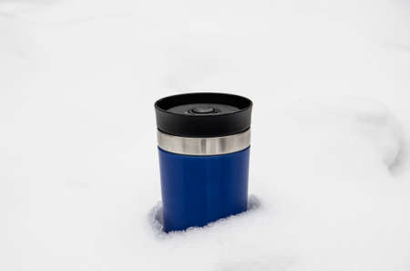 The bottle stands on the snow. Metal dishes vacuum. Hot coffee is brewed in a bottle . Winter cold photo. High quality photo