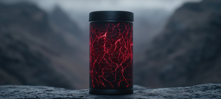 Futuristic energy cell canister with glowing amber liquid housed in a rugged metal cylinder. Illuminated accents and visible fluid motion rest on a reflective surface, suggesting industrial power and advanced storage