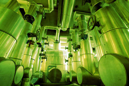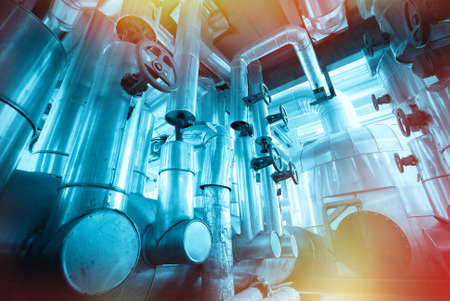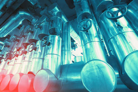 Equipment and piping inside of industrial plant. Industrial Factory. Various mechanisms and metal pipes. Toned image.