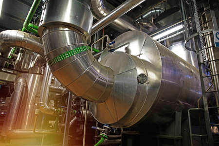 Steel pipes and tank for wort boiling at beer factory - brewery equipment. Production, manufacture, industrial concept