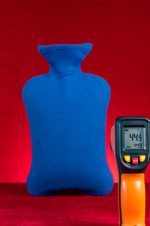 infrared thermometer shows the surface temperature of a hot water bottle vertical composition