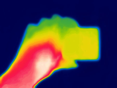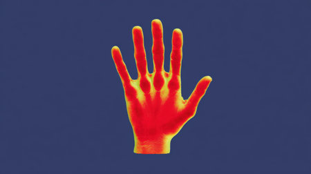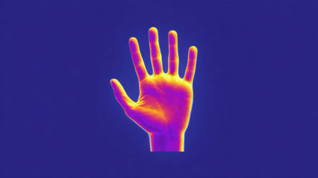 This striking thermal image showcases a human hand in vibrant colors against a contrasting background, highlighting temperature variations and artistic flair.