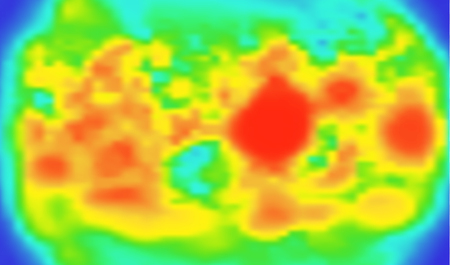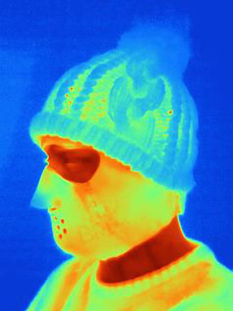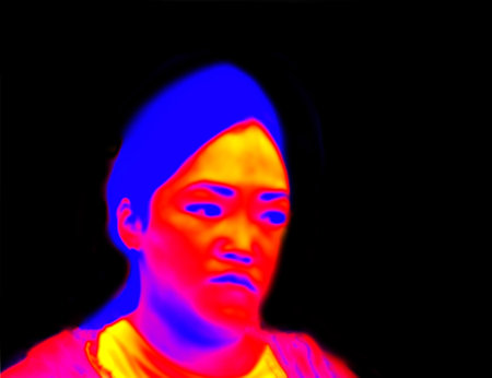 Thermographic image of a human face and neck showing different temperatures in a range of colors from blue cold to red hot. Red in the neck might indicate raised CR-P levels, this could be a sign of inflammation, and Carotid Artery inflammation which coul