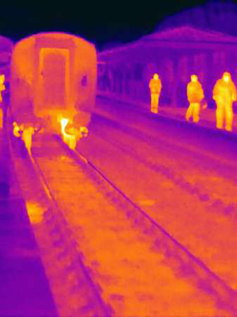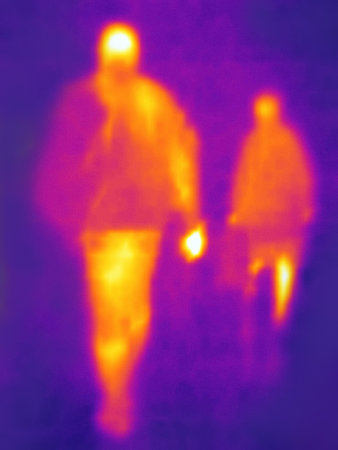 Infrared Thermal image of people walking the city streets, on a cold winter day