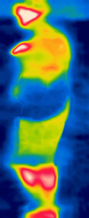 Thermal map with human silhouette showing heat distribution in vivid colors. concept of body heat visualization, temperature analysis, thermal imaging. illustration.