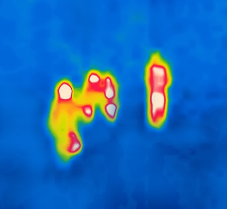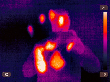 Hand gestures captured on thermal imager device. Warm hands of an ordinary person. Grab with hand.