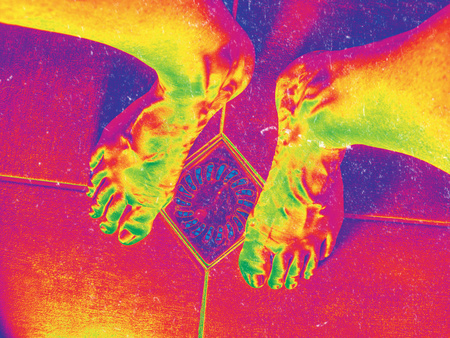Thermo scan of naked shaved woman legs. Thermal camera filter effect. Woman with the photo showing different temperatures