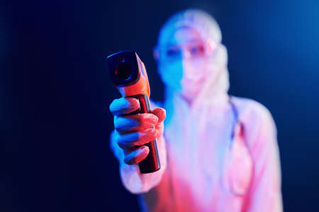 Nurse in mask and white uniform standing in neon lighted room and holding infrared thermometer. Stop coronavirus spreading.