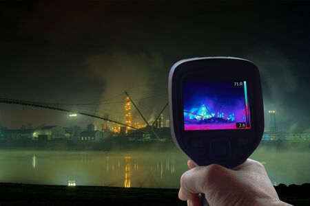 A worker wearing helmet and protective clothing using thermal camera for infrared leak detection industrial piping, focused inspection
