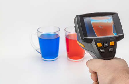 cup with a hot drink is displayed on the thermal imager screen. selective focus. the temperature meter shows the heat level. display shows a hot object