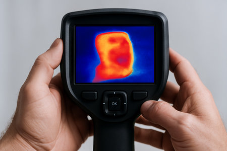 Hands holding thermal imaging device capturing object heat signature. concept of thermal technology, heat detection, surveillance equipment.