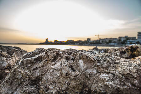 Rocky beach with red and orange stones. Seashore along Harry S. Truman Street, Tel Aviv-Jaffa, Israel