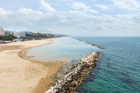 Stone breakwater on adriatic sea in Termoli, Italy with beautiful wide beach and city in the background