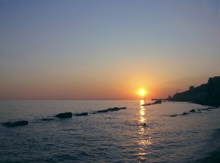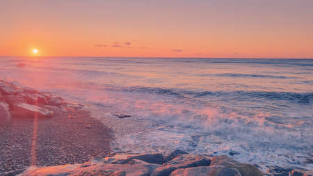 Seascape of rocky beach. Sunset Black Sea in Batumi. Panoramic view of the seashore. A beautiful rocky beach at sunset