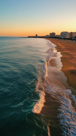 Golden beaches stretch along the peaceful Mediterranean coastline as the sun rises, casting a warm glow over the calm blue waters and gentle waves.