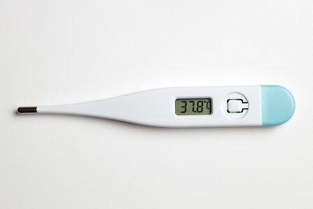 Digital thermometer with a display for taking your temperature on a wood desk