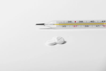 Isolated mercury thermometer and pills on the white