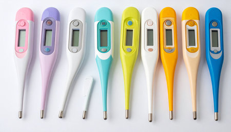 A vibrant collection of digital medical thermometers lined up, showcasing a spectrum of colors.