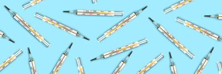 Mercury-in-glass thermometer creative pattern on blue background flat lay healthcare, treatment concept banner hospital doctor