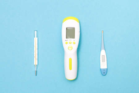 three thermometers on a blue background, electronic, mercury and infrared thermometers for measuring body temperature