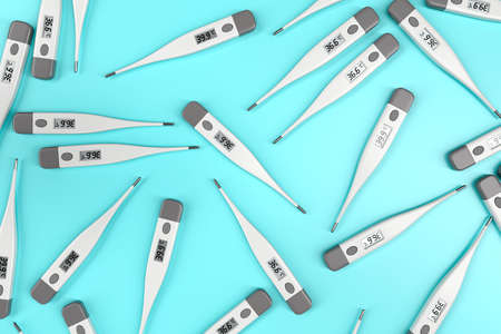 Background of scattered white digital thermometers with normal and high temperature markings. Infection diagnosis concept. 3d rendering.