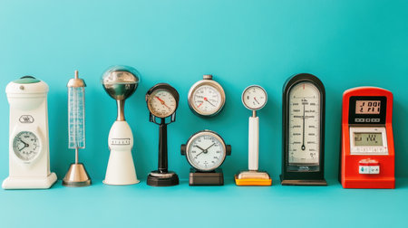 Set of modern kitchen timers, thermometers, and digital scales, placed on a vibrant teal background
