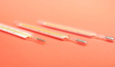 three medical thermometers lie on a red background
