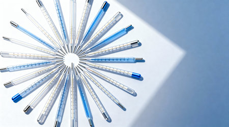 A creative digital illustration depicting Abstract illustration of medical thermometers forming a sunburst pattern, clinical lighting, clean and precise colors, modern medical design. This AI-generated artwork features unique visual elements suitable for various commercial and editorial applications. AI-generated illustration.