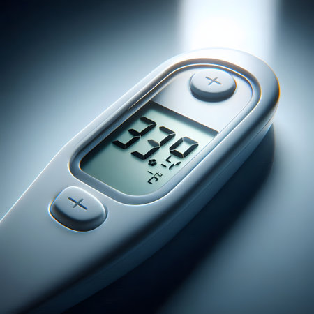 Modern showing digital thermometer displaying 98.6 degrees fahrenheit on a gray surface keywords: thermometer, digital thermometer, temperature,...