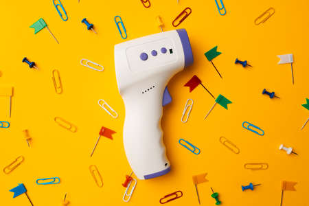 Non-contact infrared thermometer on yellow background. Concept of new schooling guidance after coronavirus lockdown