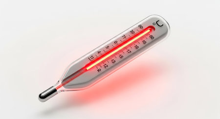 a single thermometer suspended in the air, tilted slightly. A bright red liquid column indicates a temperature. The thermometer is surrounded by a warm, red ambient glow, suggesting intense heat or a feverish state. The clean, white background provides a stark contrast, attention to the instrument and its reading. The focus is on the visual representation of elevated temperature.