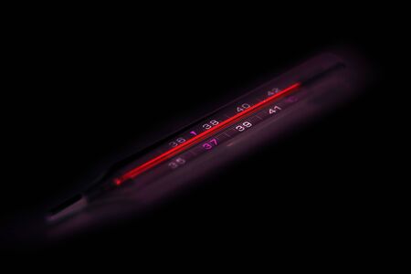 Hand with a thermometer with a high temperature of 38.6 degrees. The red gradient draws attention to dangerous temperatures. The symbol of the threat. Concept of the disease