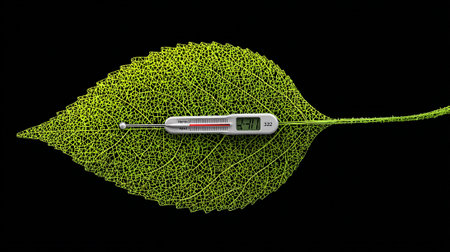 Thermometer and green leaf on black background. 3d illustration