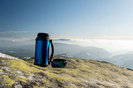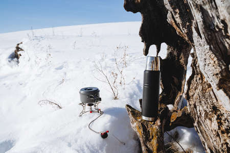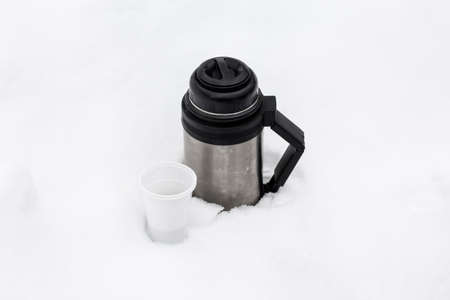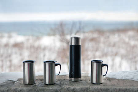 winter picnic on the snow. Hot tea, thermos and snow behind the sea. Outdoor seasonal activities.