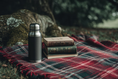 Settle down for a relaxing picnic on a tartan blanket, featuring a thermos and a couple of cherished books surrounded by natures tranquility.