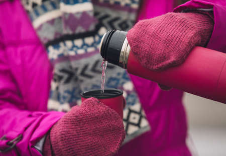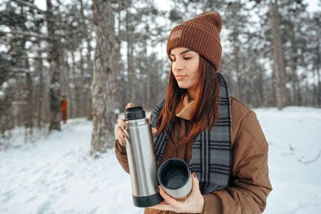 Woman in gloves pours hot tea from a thermos in the winter forest