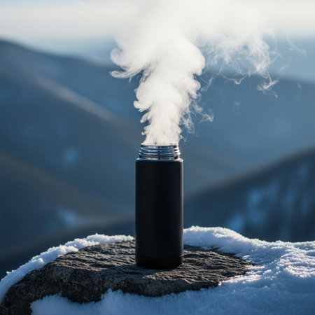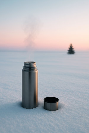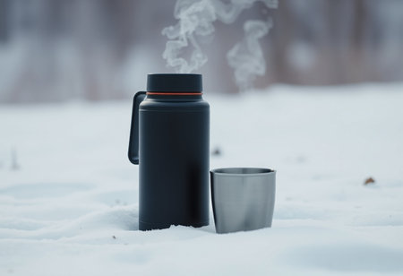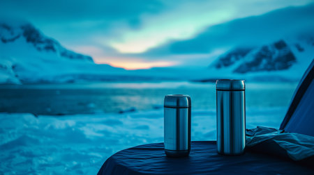 Scenic Winter Camping Morning with Steaming Thermos and Cup by Snowy Lakeside. Concept of Tranquil Outdoor Adventure, Cozy Warm Beverage, Serene Nature Setting.