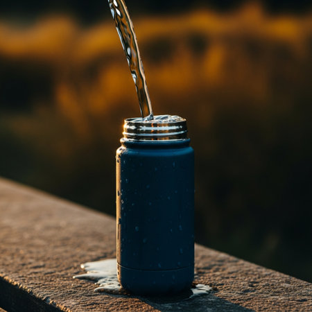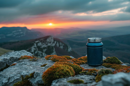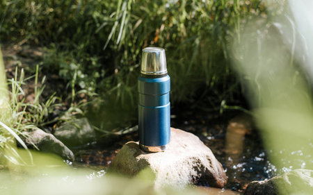 Close-up of a vacuum thermos, a camping flask on a stone near a stream in the forest on a sunny day.