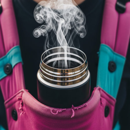 A close-up of a stainless steel thermos with a lid off, showing condensation and the warm contents inside.