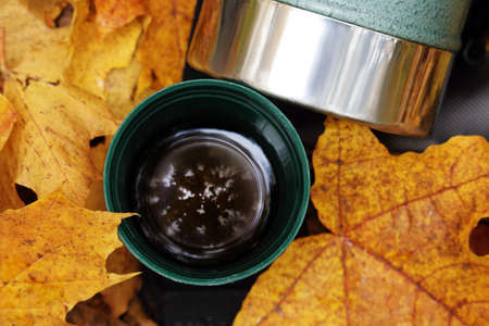 The flask lies on the autumn foliage. copyspace. Metal vacuum flask
