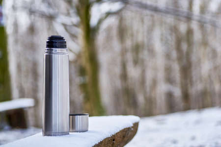 A stainless steel flask with hot tea stands on a bench in the snow. Winter unfocused forest background.